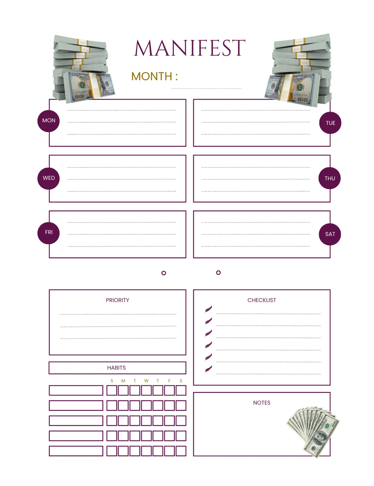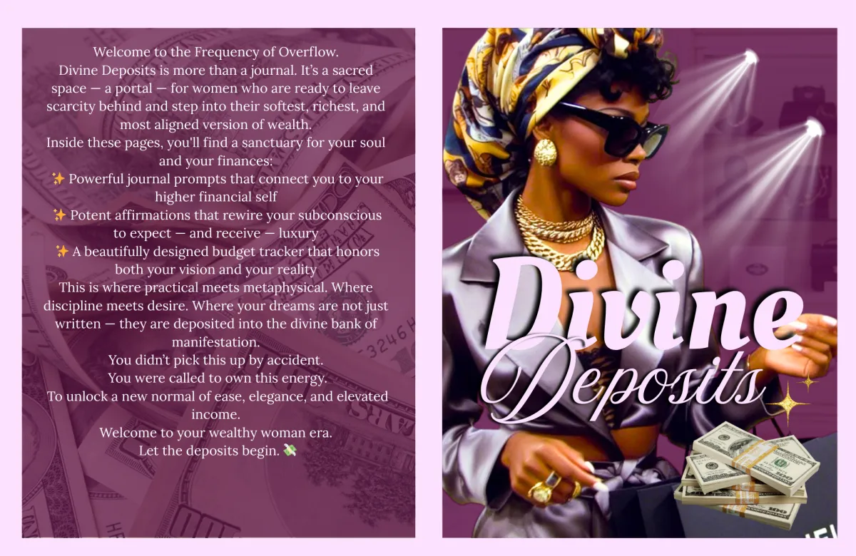 Divine Deposits is a sacred, high-frequency tool for the woman becoming wealth itself. This isn’t just a planner — it’s a portal. Inside, you’ll find divinely designed journal entries that clarify your vision, a sleek budget tracker to master your money flow, and potent subconscious affirmations that rewire your inner world for effortless abundance. Each page is an energetic transmission — a blend of structure and soul — guiding you to embody wealth, magnetize overflow, and live in alignment with your highest timeline.
