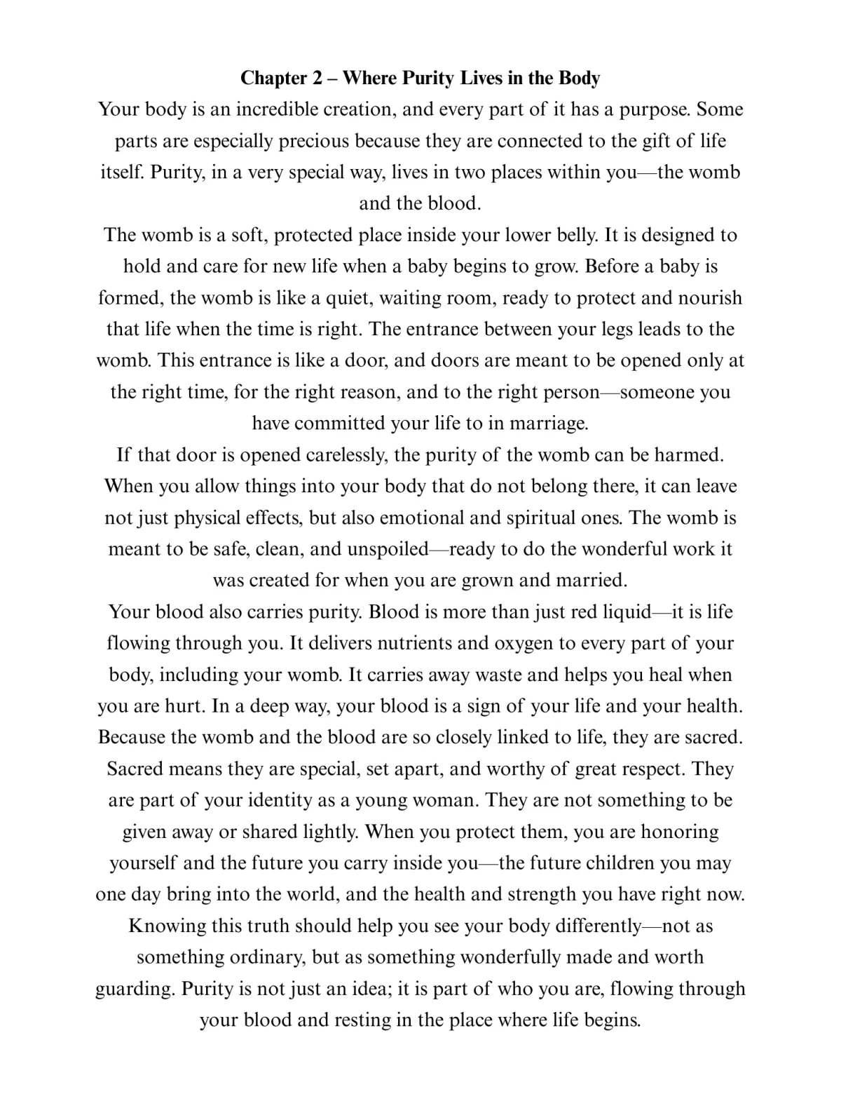 Seven Insightful Chapters – Covering topics such as “What is Purity?”, “Where Purity Lives in the Body,” “Purity and Psychological Health,” and “Guarding Your Purity.” Each chapter offers easy-to-understand lessons that connect personal choices to physical, mental, and emotional well-being.